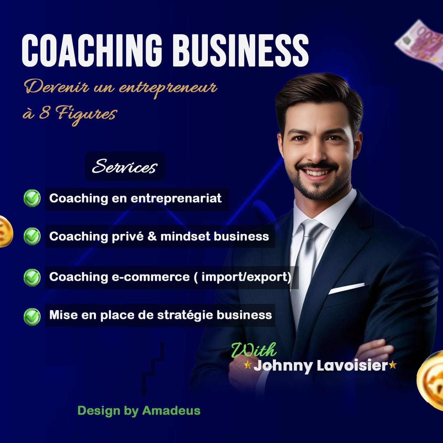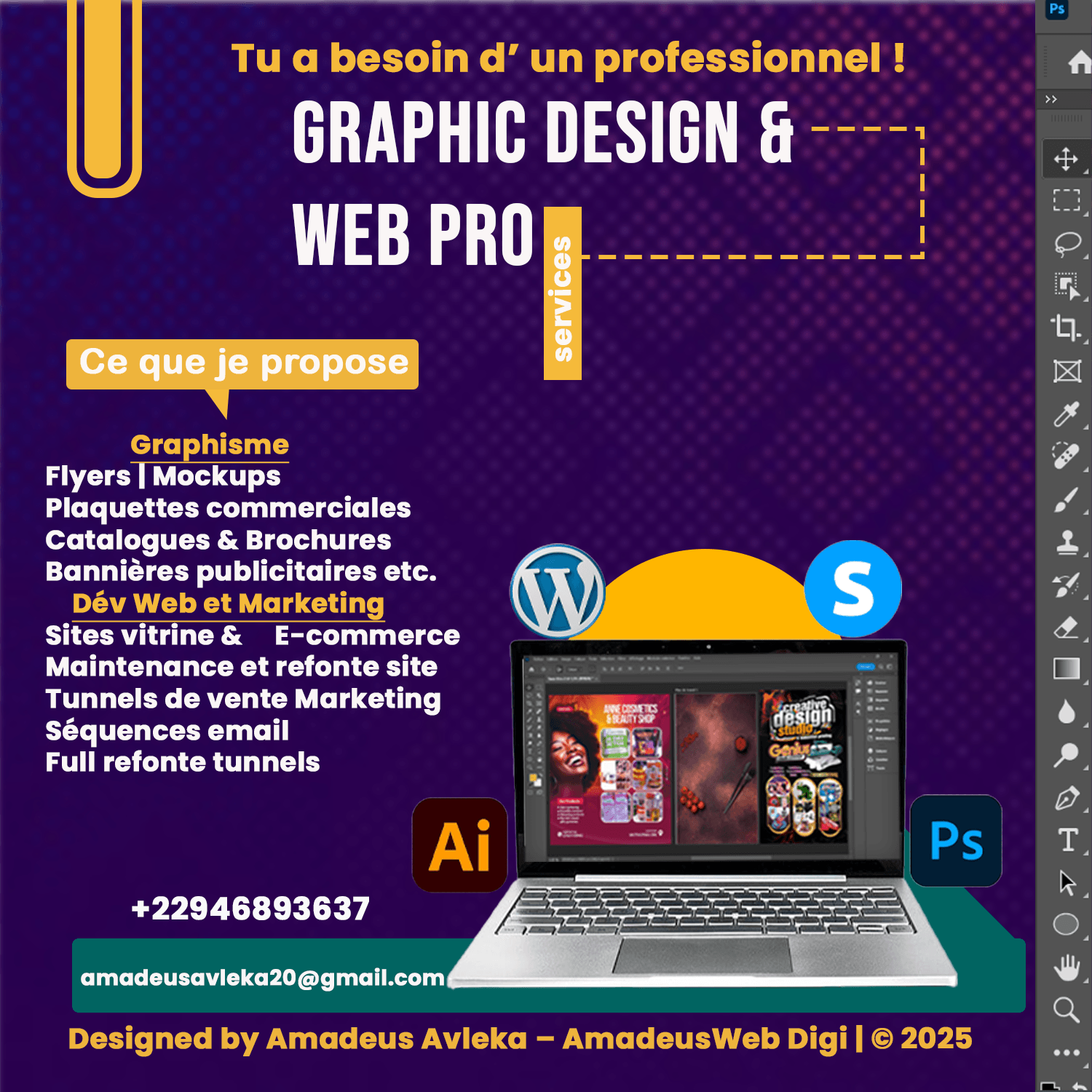 Je m'appelle Amadeus Avleka, un passionné de graphisme et de webdesign. Je me spécialise dans la création de flyers percutants, visuels pour réseaux sociaux, produits marketing, publicités impactantes, ainsi que dans la conception de sites WordPress (sites vitrines, e-commerce, portfolios et landing pages avec Systeme.io).